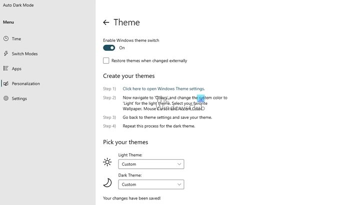 Nel complesso, Auto Dark Mode è un eccellente software che funziona in background, passando senza problemi dalla modalità scura a quella chiara in Windows. Finché è previsto l'esecuzione in background, funzionerà correttamente e assicurati anche di cambiare tema. Puoi scaricare Auto Dark Mode X quida Github.com.