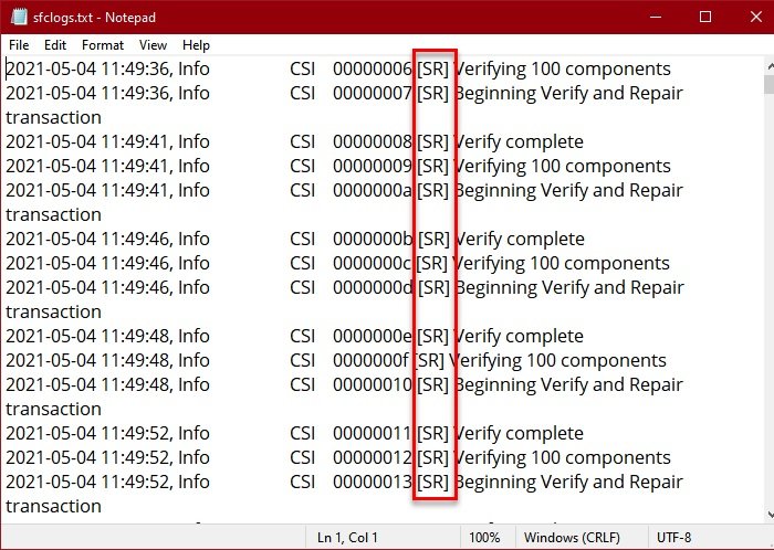 Questo creerà un file,sfclogs.txt, sul desktop. Fare doppio clic su di esso per aprire il file con Blocco note e leggere il file. Vedrai "SR" scritto davanti a ogni transazione. Ciò significa che tutti i programmi mostrati qui appartengono a SFC.exe.