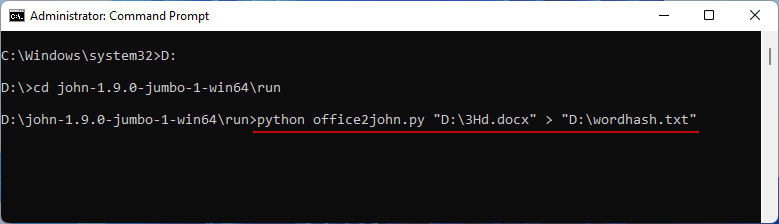 ステップ 10:「 python office2john.py ‘D:3Hd.docx’ > ‘D:wordhash.txt’ 」と入力して、ヒットします。