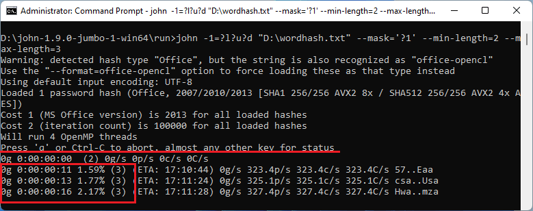 ステップ 15:「john -1=?l?u?d “D:wordhash.txt” –mask=’?1’ –min-length=2 –max-length=3”」と入力し、
