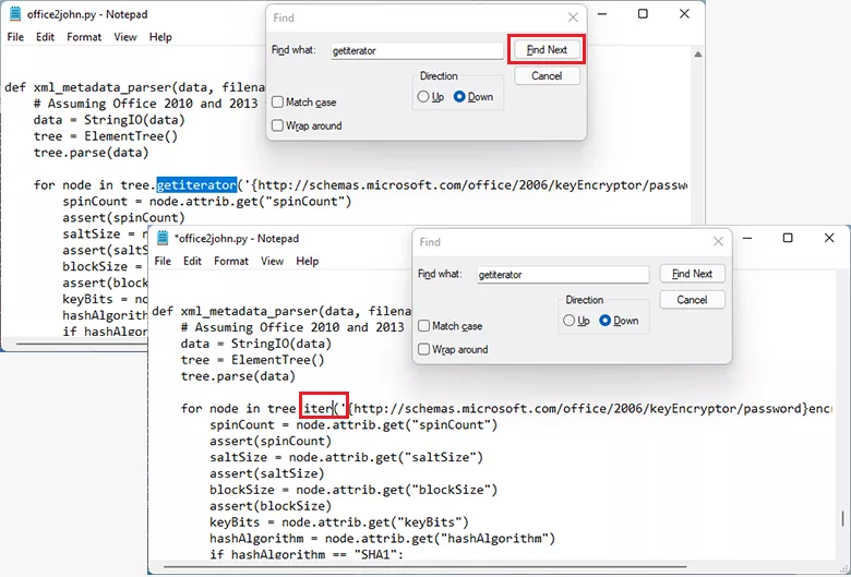 ステップ 12:メモ帳で「Ctrl + F」を押して検索機能を実行し、「getiterator」と入力してクリックします。次を探す、office2john.py ファイル内で検索します。その後、結果を次のように置き換えますイター「Ctrl + S」を入力してファイルを保存します。
