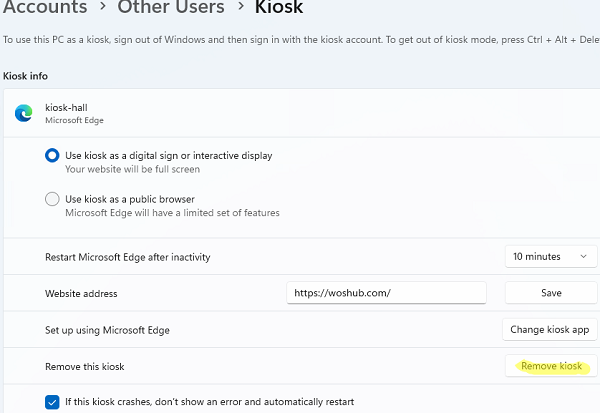 As a digit sign or interactive display) またはブラウザを使用したパブリック コンピュータ モード (As a public browser)。 2 番目のケースでは、キオスク ユーザーは任意の Web サイトを表示できます。