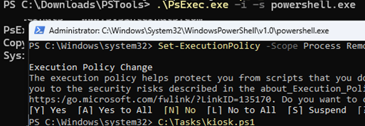 この PowerShell スクリプトをコンピューターに保存します。この PowerShell スクリプトは、MDM Bridge WMI プロバイダーを介して設定を変更するため、LocalSystem 権限で実行する必要があります。 PsExec ツールを使用して、powershell.exe コンソールを SYSTEM として実行します。