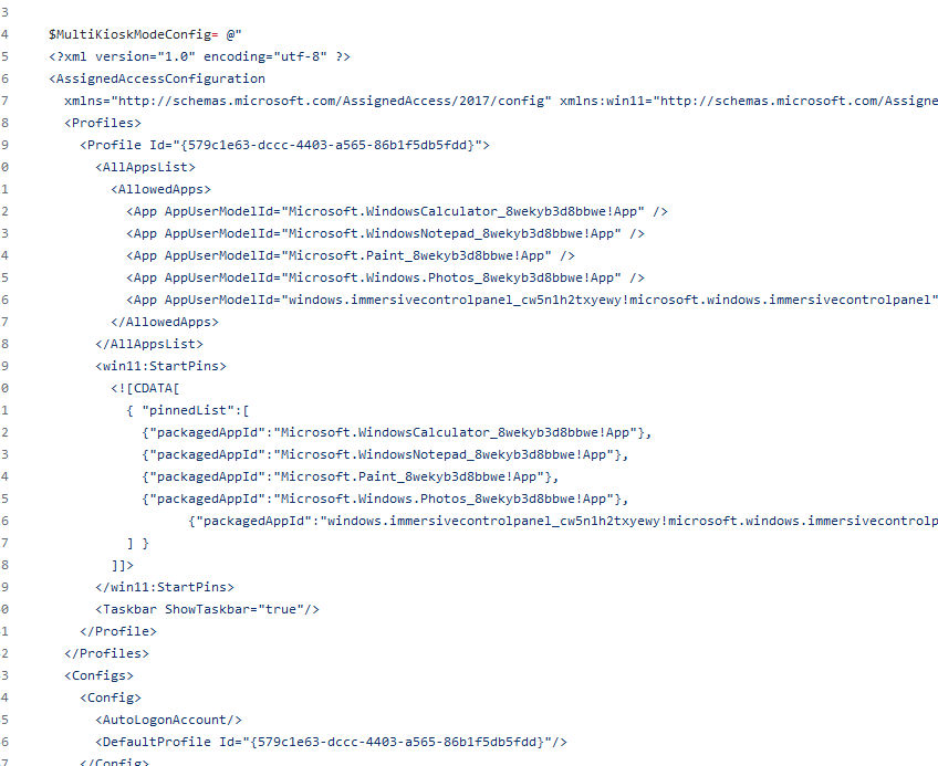 Windows 11 22H2 および 23H2 のマルチアプリ キオスク モードを構成する PowerShell スクリプトの例については、GitHub リポジトリを確認してください。 (https://github.com/maxbakhub/winposh/blob/main/WindowsDesktopManagement/enable-multi-app-kiosk-mode-win11-mdm-bridge.ps1)。このスクリプトは、XML 形式で指定された Windows キオスク モード設定を適用します。