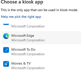 - 次のステップは、キオスク モードで起動するアプリケーションを選択することです。インストールされている UWP アプリの 1 つ、または組み込みのクラシック アプリの一部のみを選択できます。 (Microsoft Edgeブラウザなど)。
