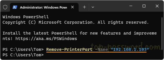 your_port_name」を、削除するプリンター ポートの実際の名前に置き換えます。Remove-PrinterPort -Name "your_port_name"