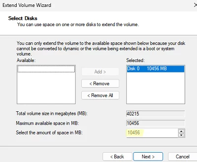 - 最大利用可能容量 (MB)現在のパーティションをさらにどれだけ拡張できるかを示します。未割り当て領域を使用してパーティションに追加する MB 量を容量を MB 単位で選択します箱。この例では、すべての空き領域をシステム ボリュームに追加します。