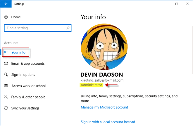 2. 現在サインインしているユーザー アカウントが表示されます。管理者アカウントを使用している場合は、ユーザー名の下に「管理者」という単語が表示されます。