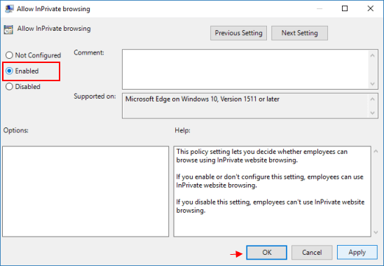 Microsoft Edge InPrivate ブラウジングを無効にするには、選択に進みます無効にするオプション。
