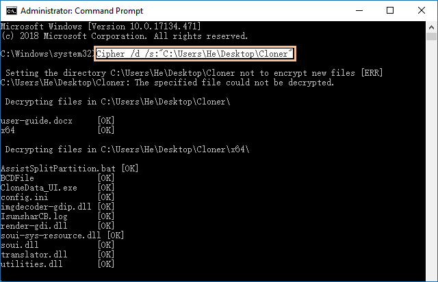 サブフォルダーとファイルを含むフォルダーを復号化するには、cipher /d / s: 「フォルダーへのフルパス」と入力します。