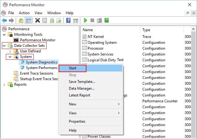 ステップ 2: 展開して開くデータコレクターセット>システム。次に右クリックしますシステム診断そして選択します始める.