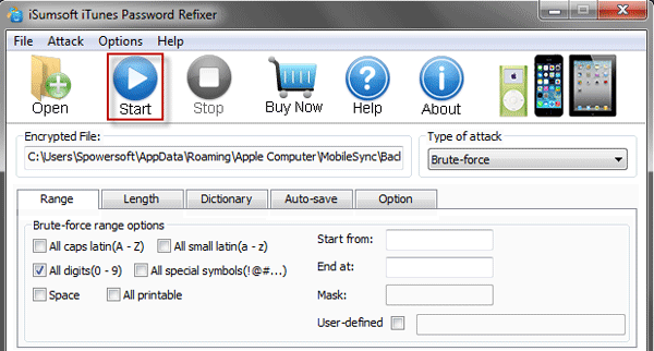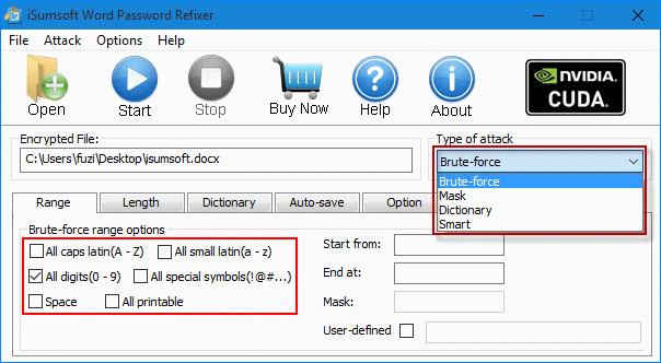 このパスワードに関する手がかりがない場合は、デフォルトの攻撃タイプを使用してください —–ブルートフォース, Word パスワードを効率的に回復するために、考えられるすべてのキーの組み合わせが試行されます。パスワードの範囲とパスワードの長さを設定して、回復効率を向上させることができます。
