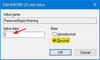 - をクリックします。10進数ラジオ ボタンをクリックし、パスワードの有効期限が切れる何日前にユーザーに通知するかを入力し、クリックします。わかりました。