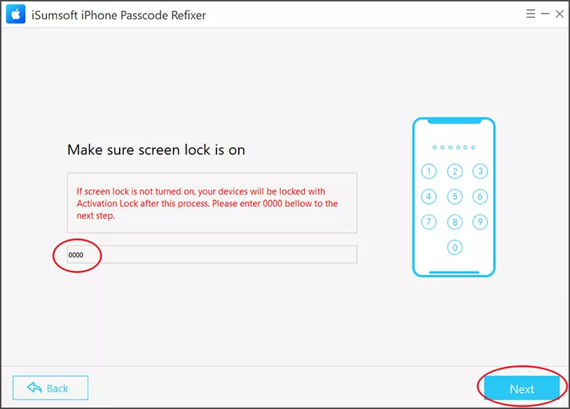 ステップ 4: iPhone のパスコード (画面ロックなど) がオンになっていることを確認し、オンになっていない場合は設定します。次に、ソフトウェア ページの入力ボックスに「0000」と入力し、「次へ」をクリックします。