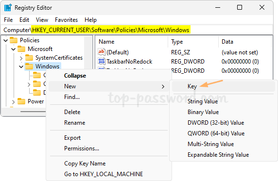 - 新しく作成したサブキーに次の名前を付けますブロックされましたを右クリックして選択します。新しい->文字列値。