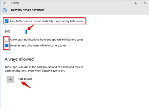 ステップ 4: オプションを選択します。バッテリーが以下の場合はバッテリー セーバーを自動的にオンにする」にチェックを入れ、スライダー バーを動かして希望に応じて値を調整します。バッテリー セーバー中、システムはバックグラウンド アプリを制限し、画面の明るさを低いレベルに調整してバッテリー電力を最大限に節約します。バッテリー セーバー モード中に特定のアプリをバックグラウンドで実行し続けたい場合は、アプリを追加する下常に許可される特定のアプリをバックグラウンドで実行できるようにします。