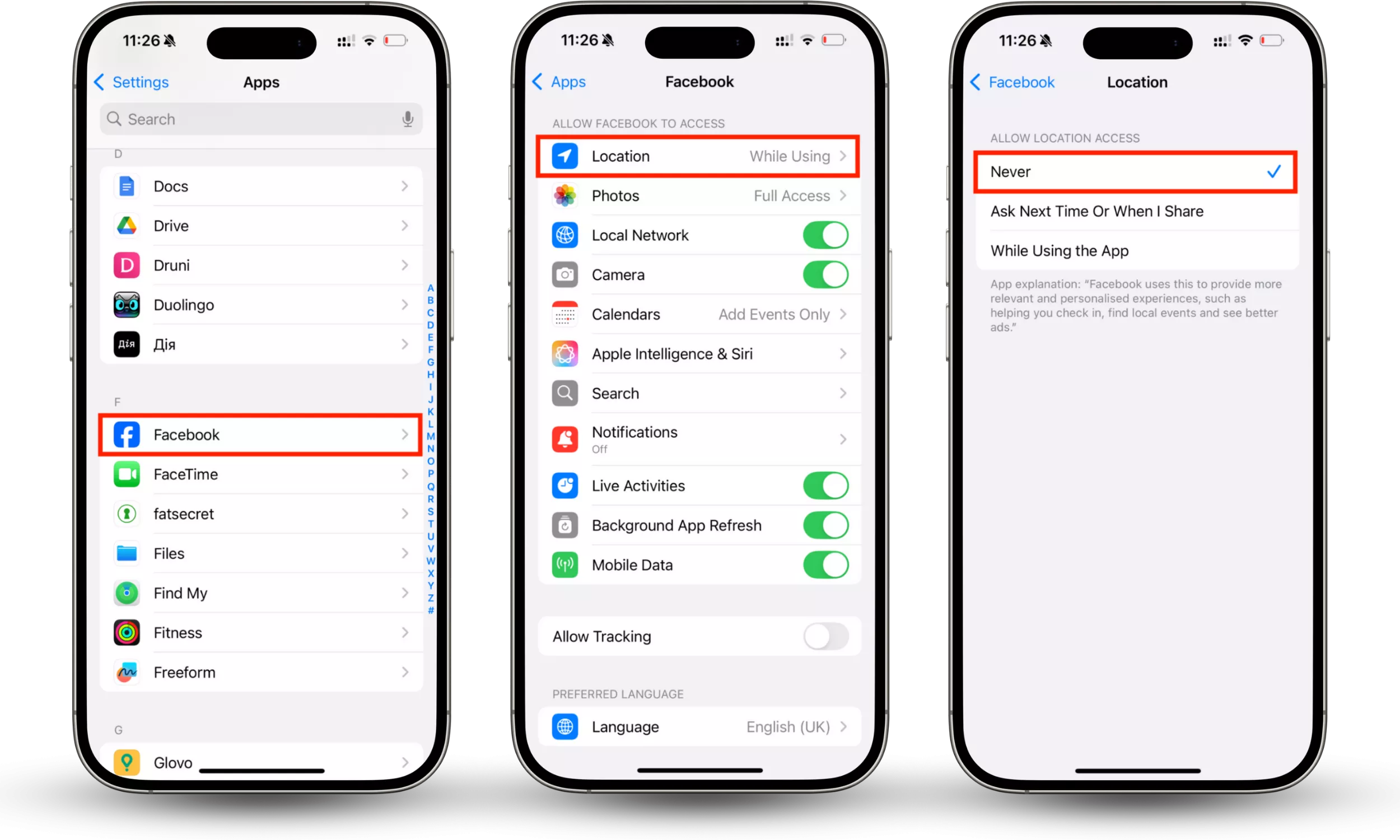 - 選ぶ位置を押してから、許可しないでくださいFacebook があなたの位置情報にアクセスするのを完全にブロックします。