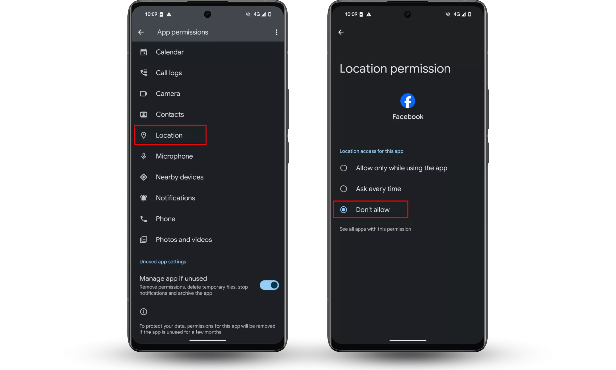 Facebook のプライバシー ポリシーにより、Facebook は携帯電話の設定とアプリを通じてあなたの位置情報にアクセスすることができます。あなたを追跡しないようにするには、両方をオフにする必要があります。 Android の場合は、次の場所に移動します。設定 > アプリ、 探すフェイスブックを選択してください権限。場所を押して押します許可しないでください。 iPhone では、次の場所に移動します。設定 > Facebook > 位置情報そして選択してください一度もない。