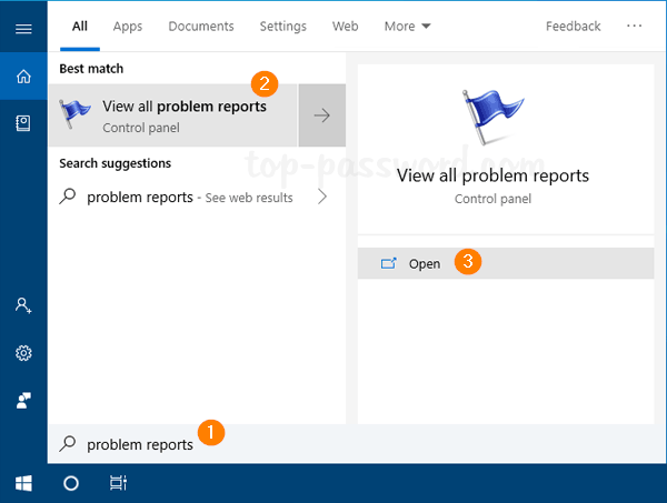 - 開始するには、タスクバーの Cortana 検索ボックスをクリックして (または WIN + S キーを押して)、「」と入力します。問題の報告”を選択し、”すべての問題レポートを表示する」と入力して開きます。