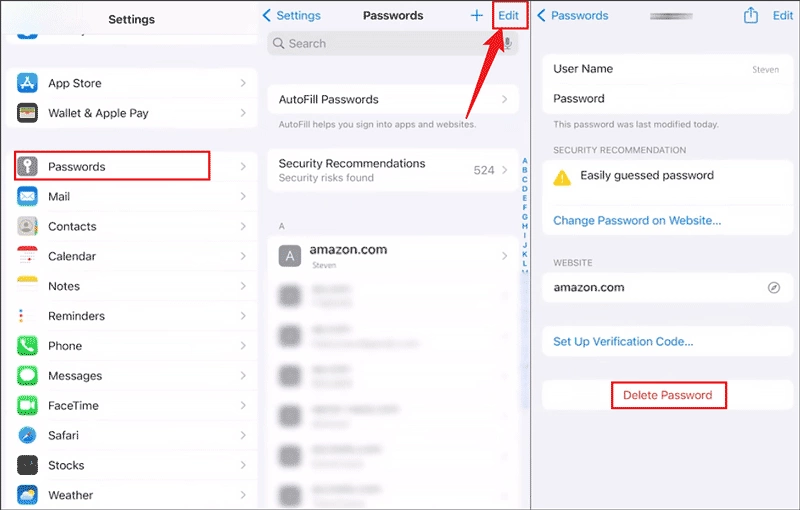 ステップ 2:右上の「編集」をタップ > 保存したパスワードを削除する Web サイトまたはアプリを選択 > 「パスワードを削除」をタップします。