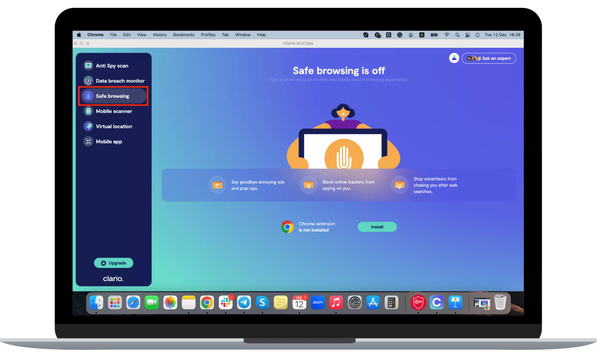 Mac デバイスでは、セーフ ブラウジングは Chrome および Safari 拡張機能として利用できます。 Windows デバイスでは、組み込みツールとして機能します。どのようなデバイスを所有していても、Clario AntiSpy のセーフ ブラウジングツールは使いやすいです。使用方法は次のとおりです。