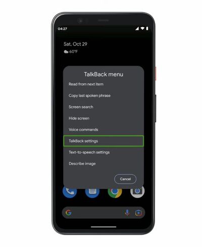 - ホームボタンを 3 回タップして TalkBack を有効にし、アクセシビリティ メニューを開きます。