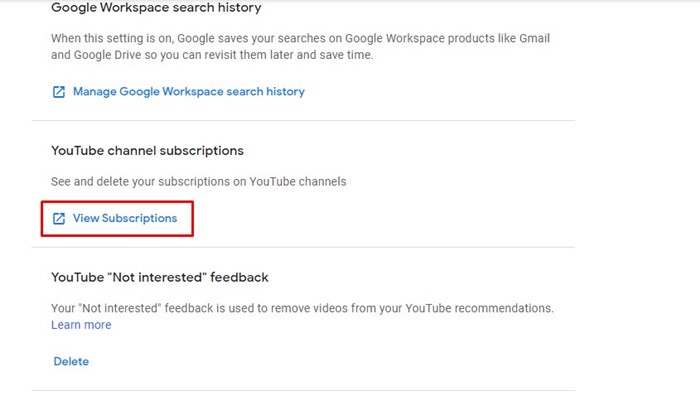 3. [その他の Google アクティビティ] 画面で、YouTube チャンネル登録。をクリックしてくださいサブスクリプションを表示するリンク。