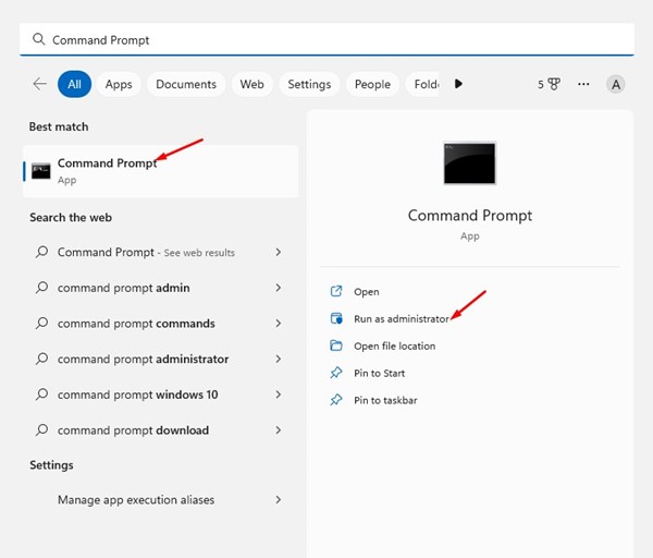 1. 「Windows Search」をクリックし、「CMD」と入力します。コマンドプロンプトを右クリックして選択します管理者として実行.