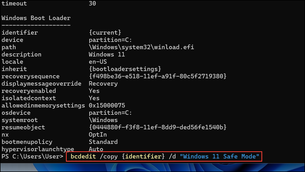 bcdedit /copy {identifier} /d "Windows 11 Safe Mode"