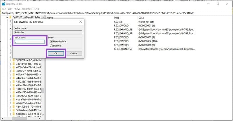 ステップ2。レジストリで、「HKEY_LOCAL_MACHINESYSTEMCurrentControlSetControlPowerPowerSettings54533251-82be-4824-96c1-47b60b740d00 cc5b647-c1df-4637-891a-dec35c318583」に移動します。