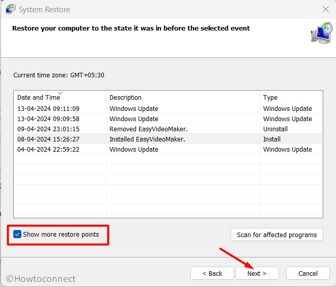 - 選択次へ >そして復元ポイントを選択します。この時点は、最初にエラーが発生するよりも前である必要があることに注意してください。