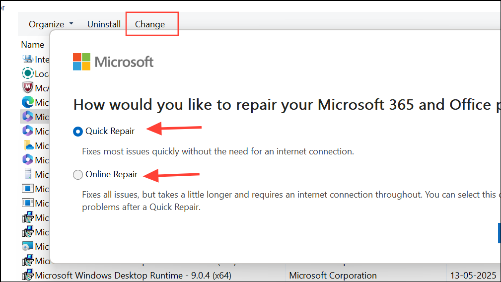 ステップ 3:選択マイクロソフトオフィス、 クリック変化を選択し、クイックリペアまたはオンライン修理。 Excel を再テストする前に、プロンプトに従ってコンピューターを再起動します。