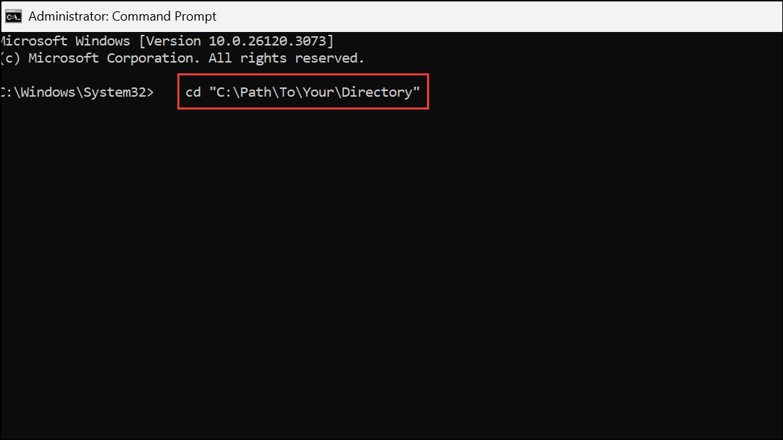 ステップ 1:管理者としてコマンド プロンプトを起動し、次のコマンドを使用して影響を受けるディレクトリに移動します。cd指示。