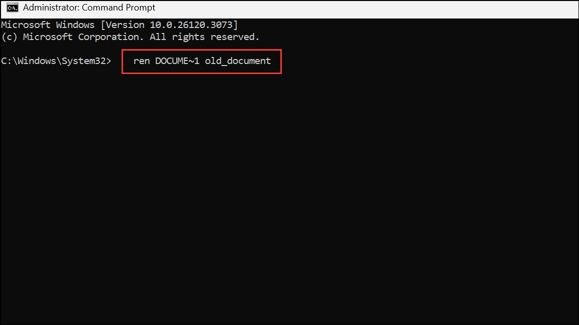 ステップ 3:競合する短縮名を見つけた場合は、renコマンドを使用して、問題のあるファイルまたはフォルダーに新しい一意の名前を付けます。例えば: