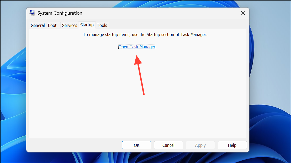 ステップ 3:に切り替えますStartupタブをクリックして選択しますOpen Task Manager。タスク マネージャーで、すべてのスタートアップ項目を無効にします。タスクマネージャーを閉じて、OKシステム構成ウィンドウで。コンピュータを再起動します。