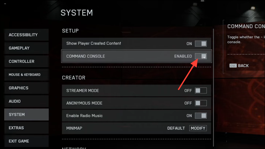 ステップ 3:下にスクロールして、Setupセクション。ここには、コンソール ウィンドウを無効にするオプションがあります。この設定をオフに切り替えます。コンソールを無効にすると、デフォルトのキー バインドでコンソールが開かなくなり、偶発的な中断が防止されます。