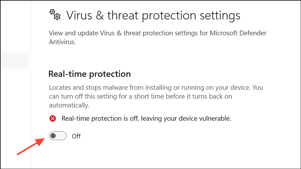 ステップ 2:リアルタイム保護の設定にアクセスします。 Windows Defender で、 をクリックします。Manage settings下Virus & Threat Protection Settingsそしてオフに切り替えますReal-time protection。サードパーティのウイルス対策ソフトウェアの場合は、アイコンを右クリックし、次のようなオプションを選択します。DisableまたはPause Protection。