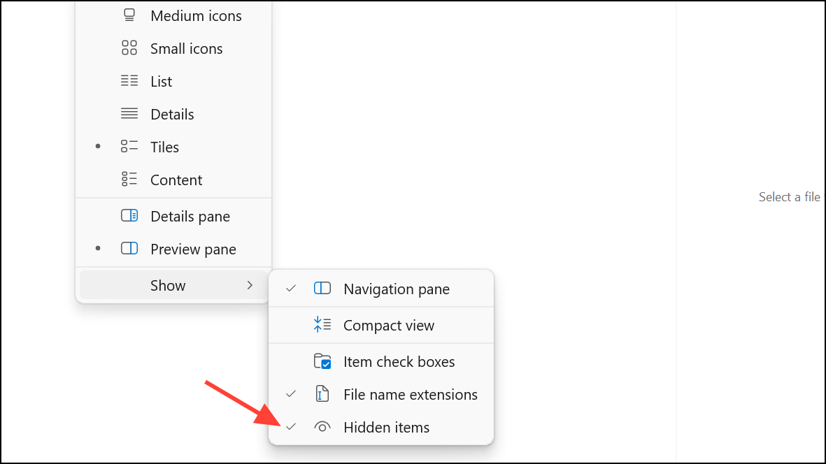 ステップ 1:ファイル エクスプローラーを開き、隠しアイテムを有効にします。ビュータブ。