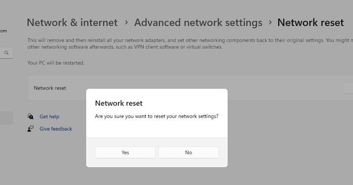5. ネットワーク リセットの確認プロンプトで、はい.
