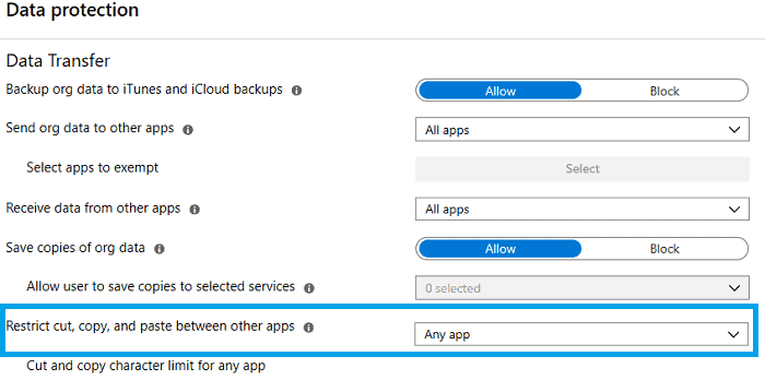 - 次に、データ転送セクションを探してください他のアプリ間での切り取り、コピー、貼り付けを制限します。デフォルトになりますに設定されるブロックされました, ただし、好みに応じて設定する必要があります。