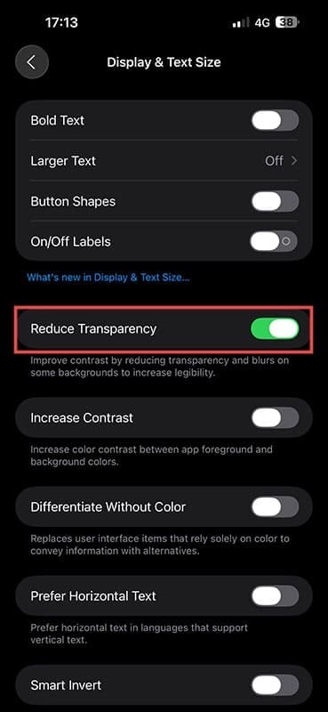 ステップ4。画面の透明度を設定するには、同じくアクセシビリティの「表示とテキスト サイズ」サブメニューで「透明度を下げる」をオンにします。