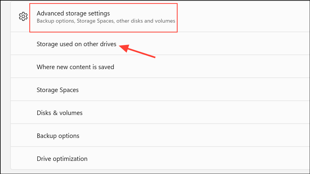 ステップ 4:ストレージ センスは、デフォルトでシステム ドライブに重点を置きます。他のドライブを管理するには、次を使用します。Advanced storage settings > Storage used on other drivesストレージメニューで。