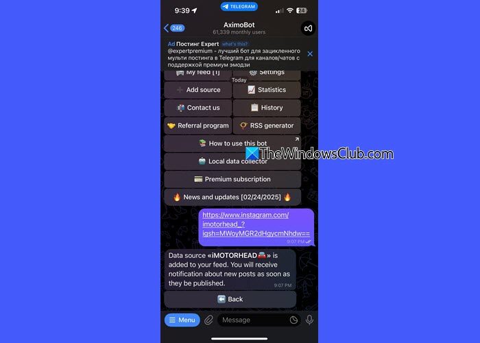 伝統的なもののように, AximoBot を使用すると、RSS フィードを購読して最新の更新情報を入手できます。プラットフォームがネイティブにサポートされていない場合、または RSS がない場合、AximoBot は次を使用して RSS フィードを生成します。RSSプロキシそしてRSSブリッジ。この投稿では、AximoBot を使用してブロックされた Instagram アカウントを追跡する方法について説明します。