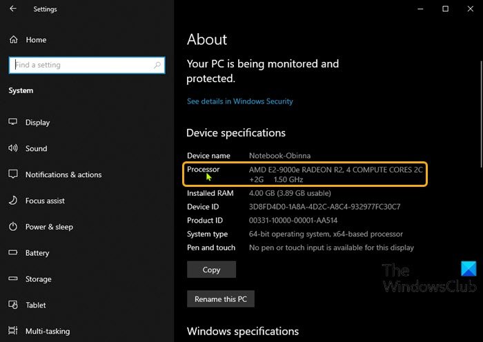 - 開いたウィンドウの右側のペインに、という名前の項目があります。プロセッサー。プロセッサーのモデルはそのすぐ隣にあります。