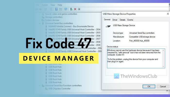 修正するにはデバイス マネージャー エラー コード 47、安全な取り外しが準備されているため、Windows はこのハードウェア デバイスを使用できませんの場合は、次の手順に従ってください。