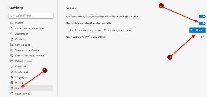 ハードウェアアクセラレーションではデフォルトで有効になっていますマイクロソフトエッジ。つまり、Web ブラウザーはすべてのテキストとグラフィックのレンダリングを CPU から GPU に移動します。 Edge ブラウザーの使用時に問題が発生した場合は、ハードウェア アクセラレーションを無効にして、違いが生じるかどうかを確認してください。これを行うと、コンピュータ上の貴重なリソースも解放されます。