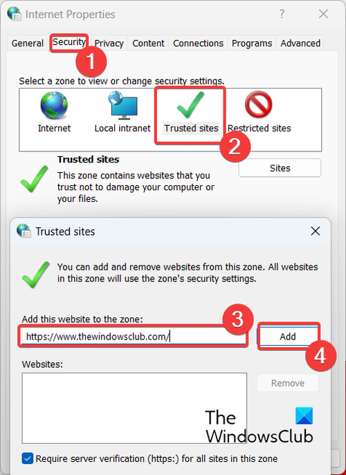 - 問題のある Web サイトを信頼済みサイトに追加します。