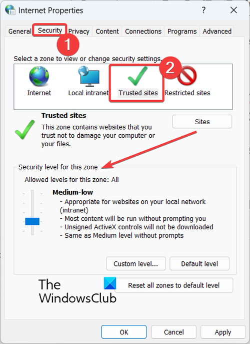 - さあ、に行ってください安全タブをクリックして、信頼できるサイトオプション。