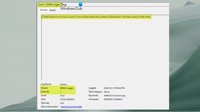 Windows ハードウェア エラー アーキテクチャ (WHEA) ロガーは、ハードウェア エラーを検出し、そのようなエラーが発生したときに Windows イベントの追跡を生成する自動サービスです。システム ログには、これらのハードウェア エラーが記録され、トラブルシューティングの目的で確認できます。のWHEA-ロガーイベントこれらは単なる一般的なエラー コードであり、ハードウェアまたはドライバーに問題がある可能性があることを示すだけです。