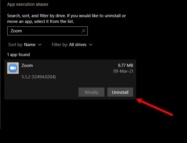 そのためには、起動します設定によるWin + X > 設定。をクリックしてくださいアプリ、Zoomを検索してアンインストールします。